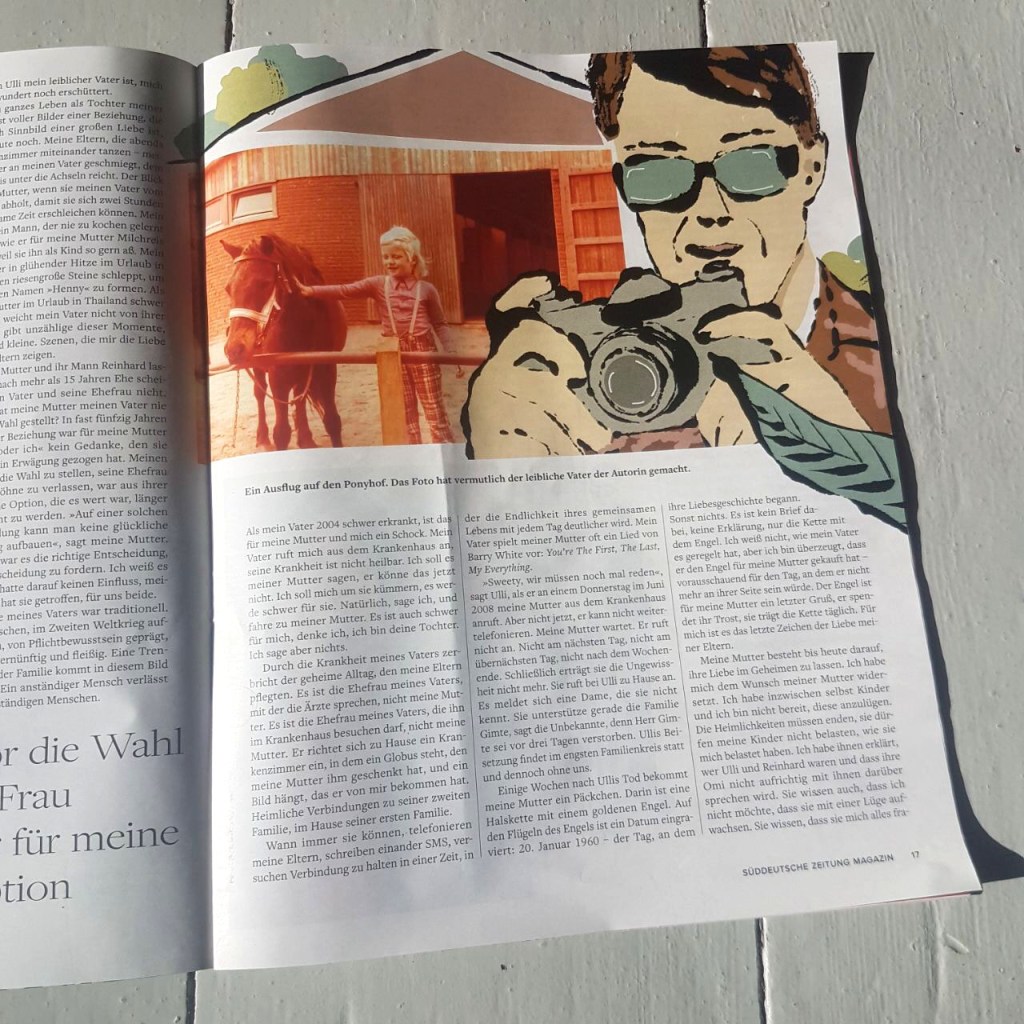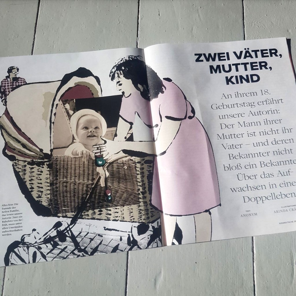 Illustrationen für das Süddeutsche Zeitung Magazin für einen spannenden Artikel über eine ungewöhnliche Familienkonstellation. Die Zeichnungen sind in Tusche und die Farben in Photoshop. Die Redaktion hatte drei Kinderfotos der Autorin, um die ich herum illustriert habe, das war etwas ungewöhnlich, hat aber Spaß gemacht! Vielen Dank an Beate Zollbrecht!