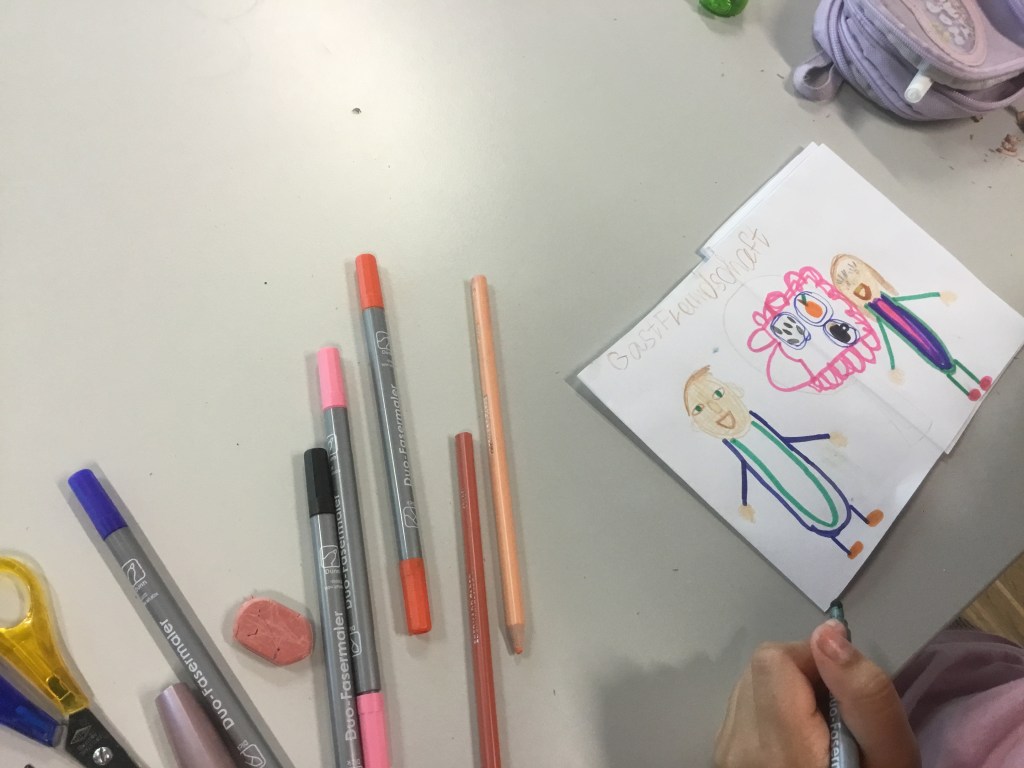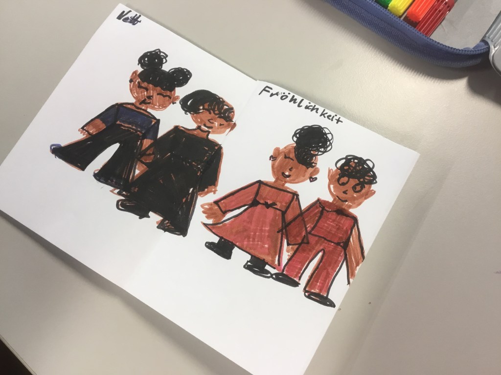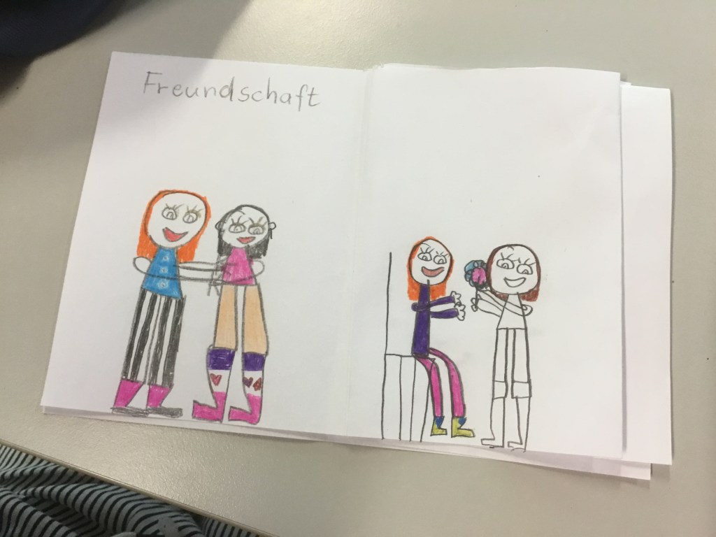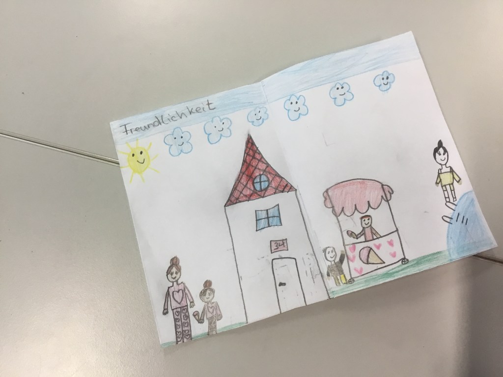 Ich bringe Originalzeichnungen mit und erkläre, wie ein Buch entsteht. Jedes Kind wählt danach drei Begriffe aus, die ihm im Zusammenleben am wichtigsten sind, und gestaltet sein kleines Büchlein, das es mitnehmen kann.