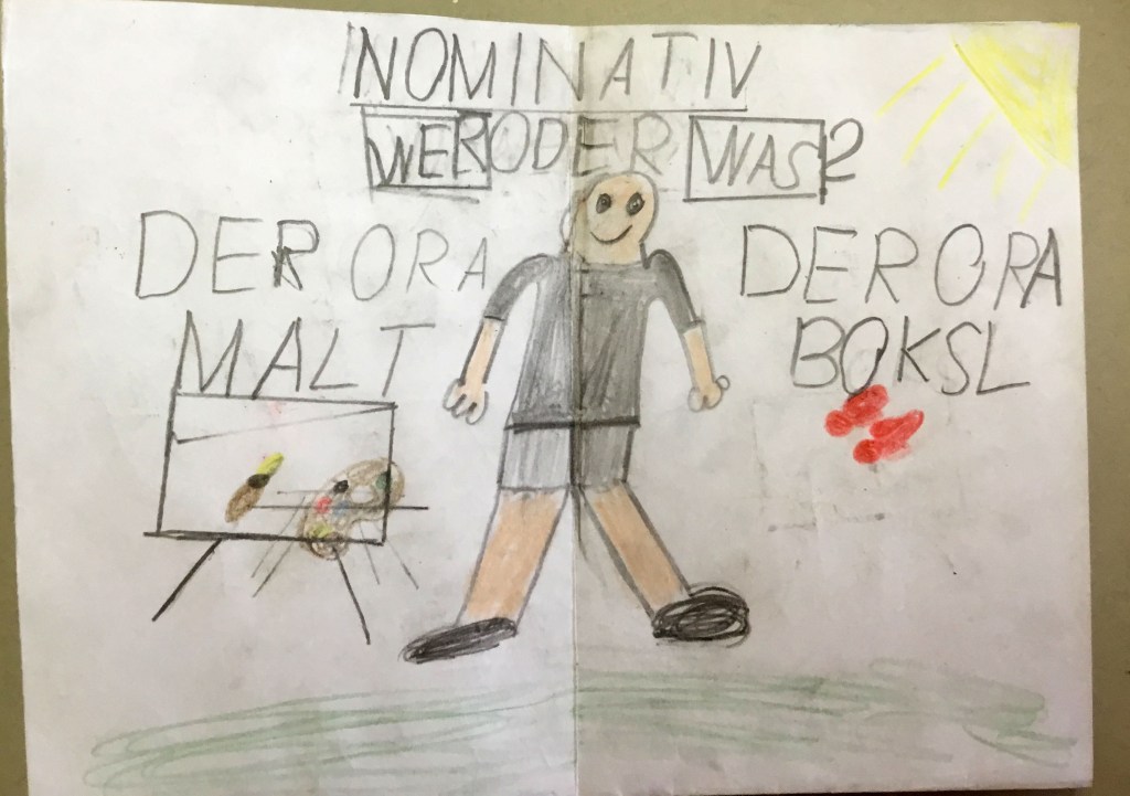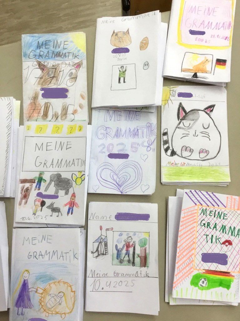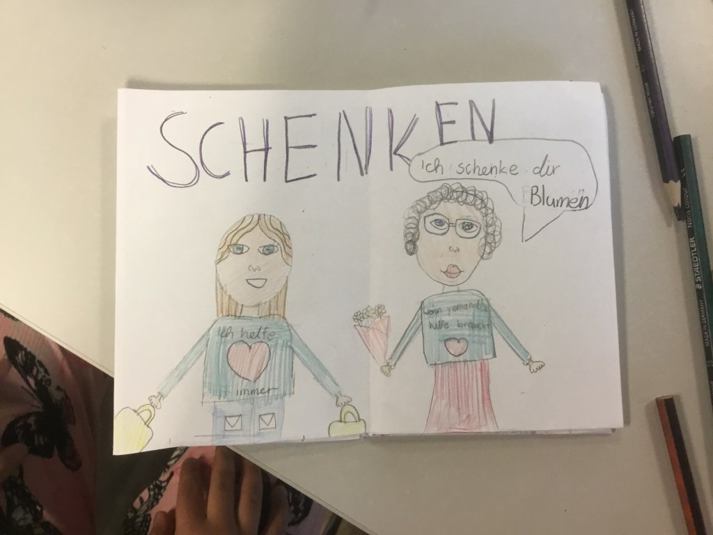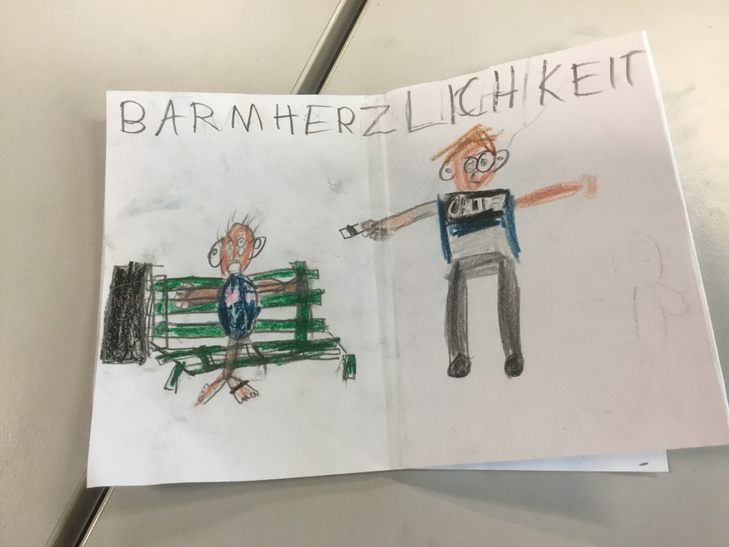 Ich bringe Originalzeichnungen mit und erkläre, wie ein Buch entsteht. Jedes Kind wählt danach drei Begriffe aus, die ihm im Zusammenleben am wichtigsten sind, und gestaltet sein kleines Büchlein, das es mitnehmen kann.